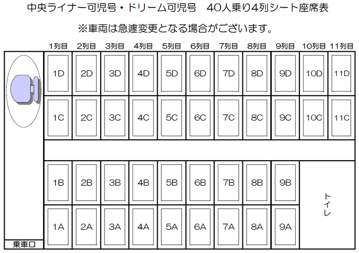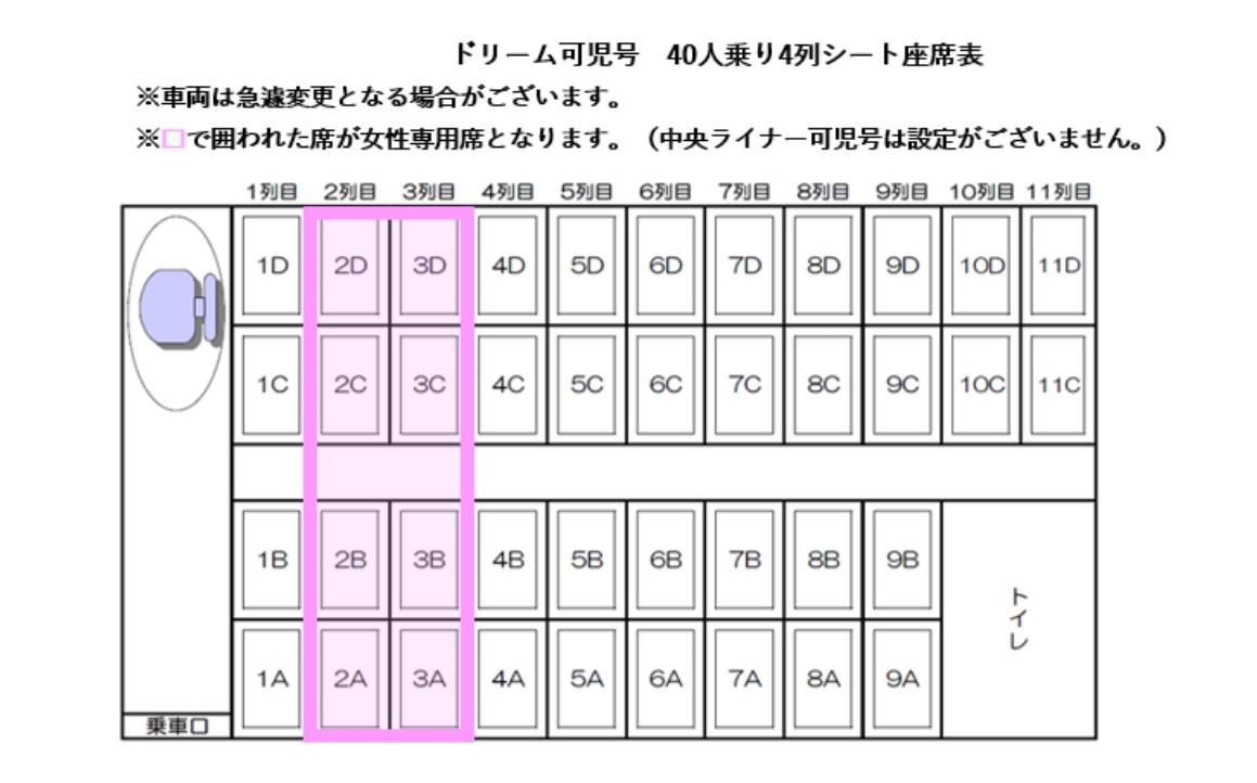 コロナ禍の影響も緩和されたことにより、直近お客様ご利用状況に伴い、ドリーム可児号のみ従来の女性専用席を8席設定いたします。(中央ライナー可児号は通常席のみです。)