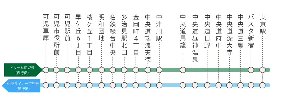 ※可児車庫⇔中央道昼神温泉間、および中央道日野⇔東京駅間各相互間のご利用は出来ません。