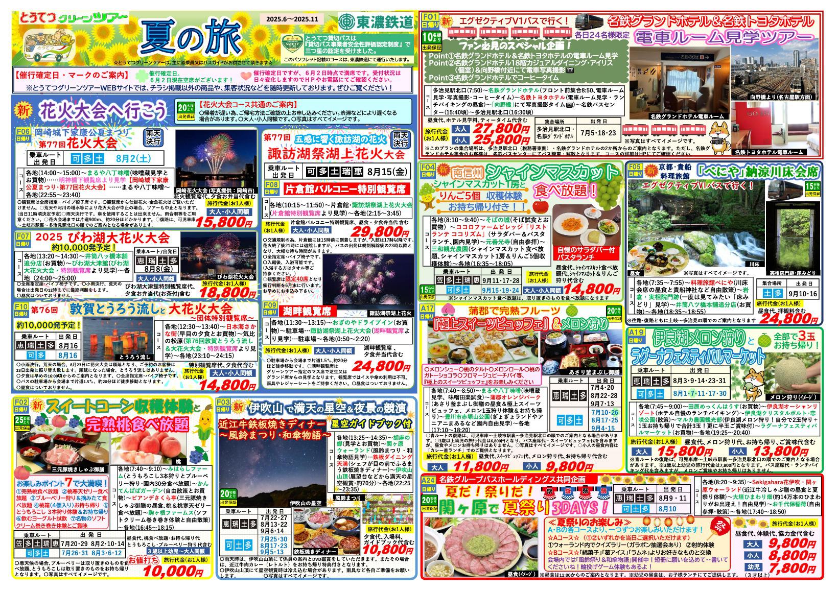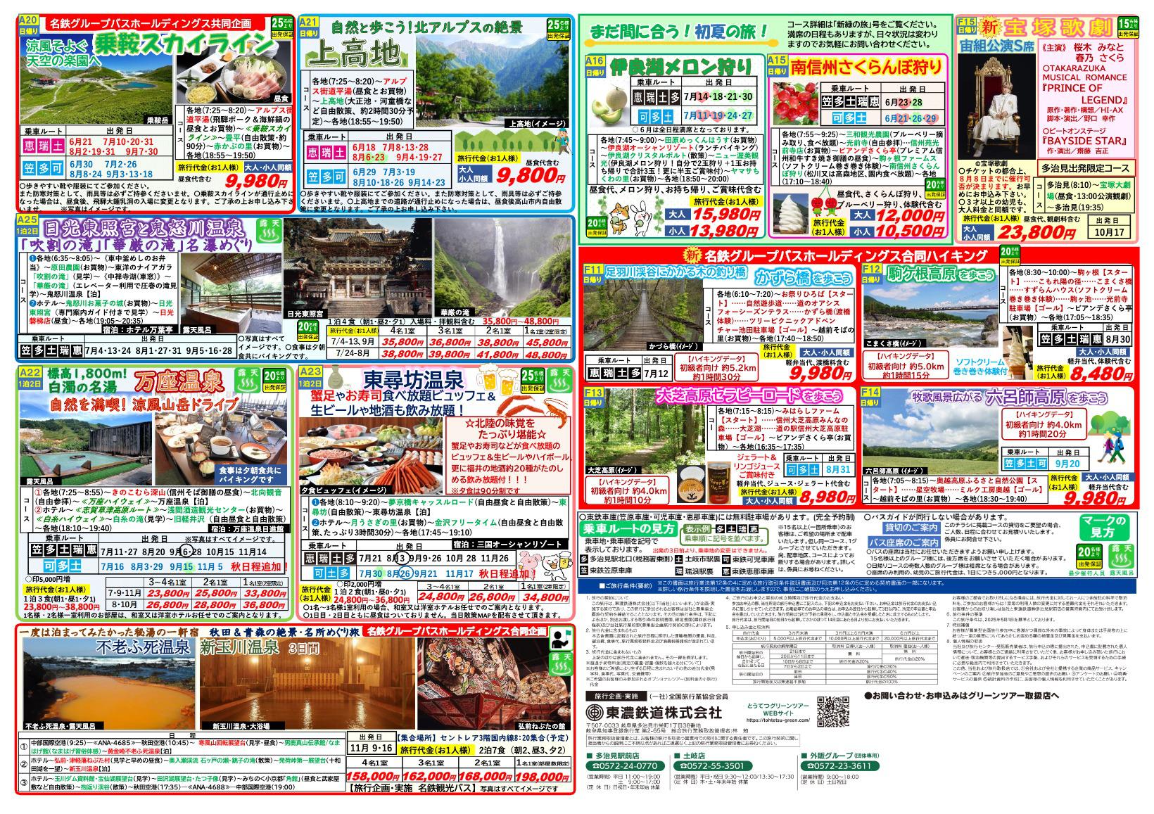 グリーンツアーの最新パンフレットは、多治見駅前店、土岐店、東濃鉄道各営業所(車庫)、東鉄アシスト(東鉄商事)、東鉄アシスト(東鉄タクシー)各営業所、グリーンツアー販売をご協力いただいております旅行会社様にございます。
