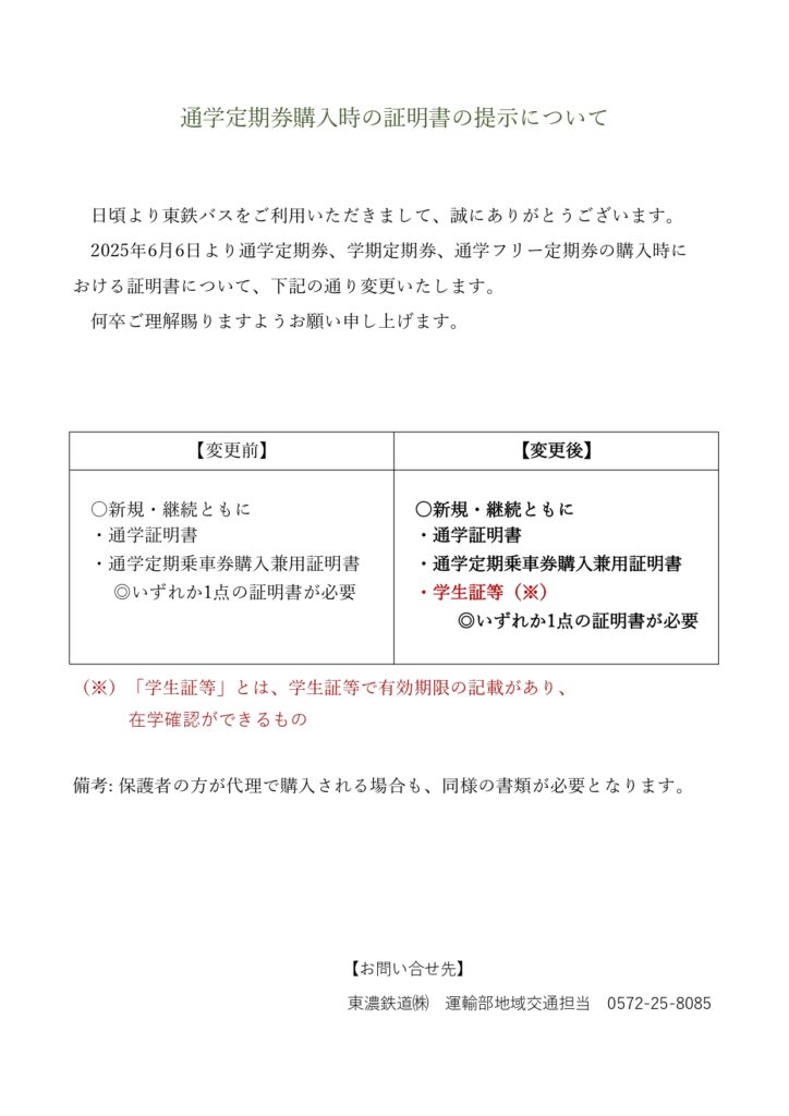 通学定期券購入時の証明書の提示について