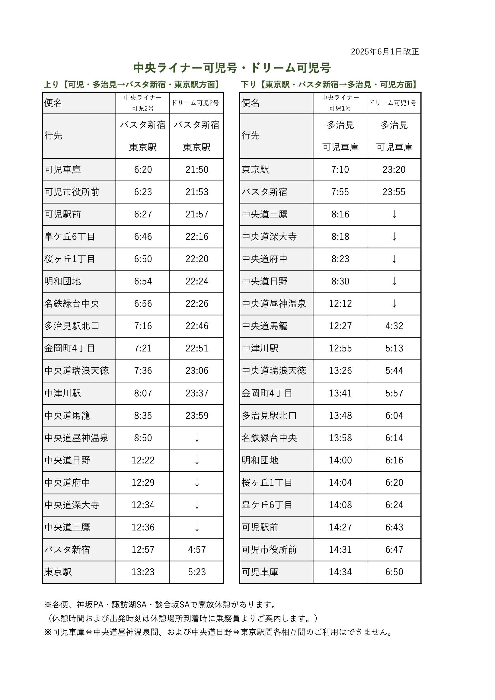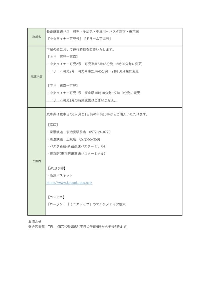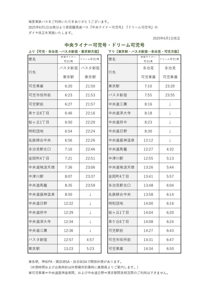 【中央ライナー可児号・ドリーム可児号】6月1日出発便より時刻表を変更いたします