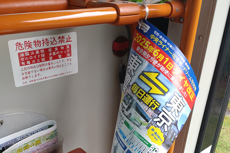 - 車内への危険物や異臭を発するもののお持ち込みは、運転に支障が出たり他のお客様のご迷惑となりますのでご遠慮ください。2019年4月1日よりバス車内に『適切に梱包されていない刃物類』を持ち込む事が禁止となりました。詳しくは以下をご覧ください。