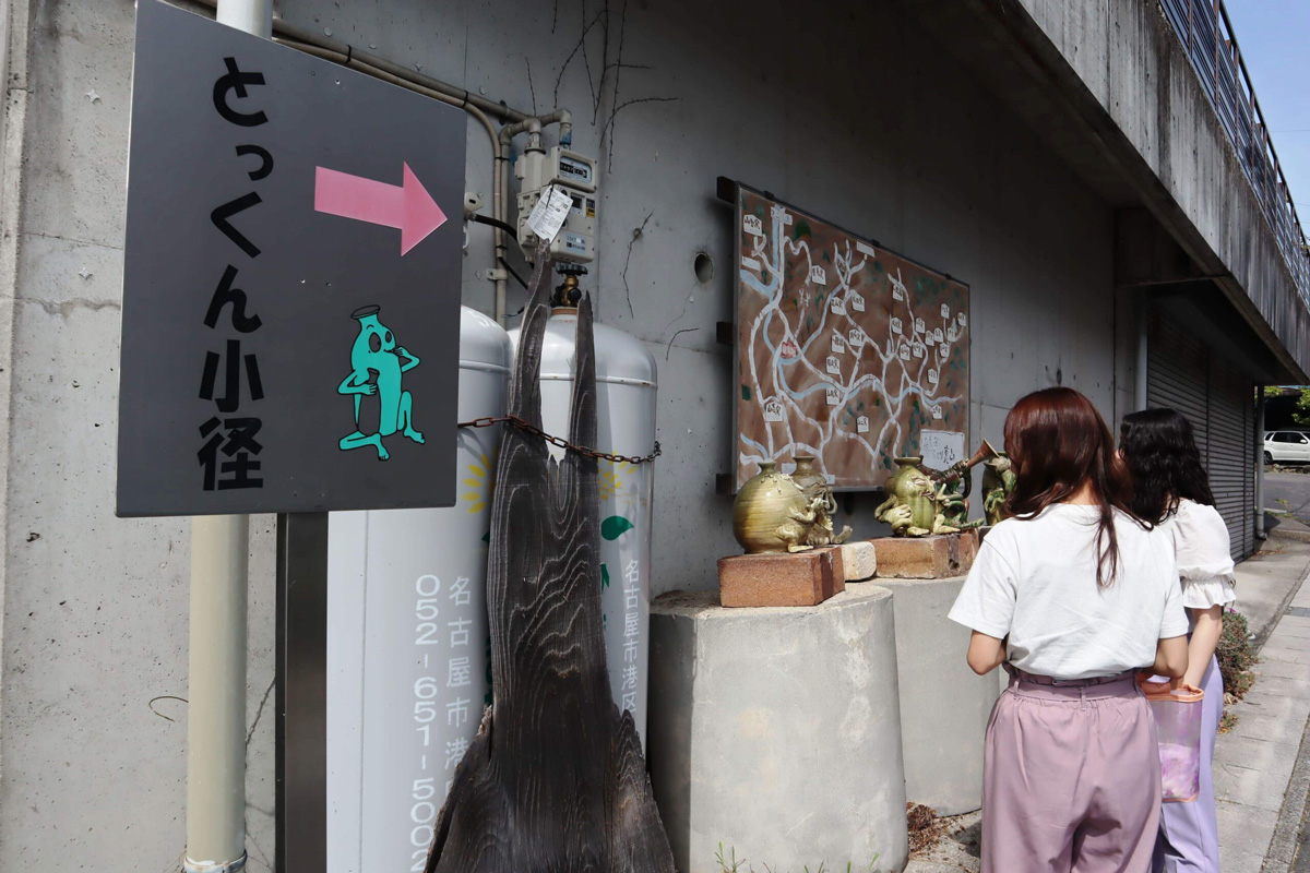 下石裏山地区の窯元エリアに、囲碁をしたり、お茶を飲んだり、煙突に登ったりいろいろなことをしている「とっくりとっくん」が佇んでいます。マップを片手に探してください。
