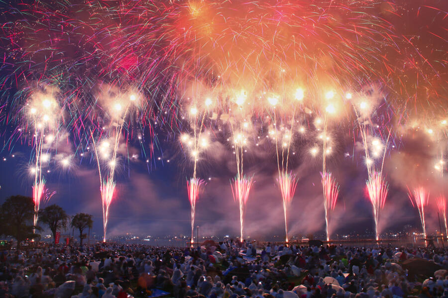 湖上ならではの水上スターマインをはじめ、圧倒的なスケール感を誇る演出が目白押し。湖上に設置された打上台から打ち上がる花火が夏の夜空を彩る。また、四方を山に囲まれた諏訪湖から打ち上がるため、その音は山に反響し体の芯まで 響き、迫力満点です。