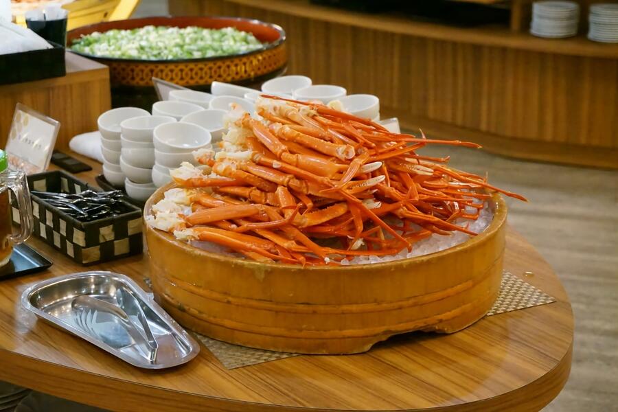 夕食は蟹足や甘えびなどが食べ放題のビュッフェスタイル!