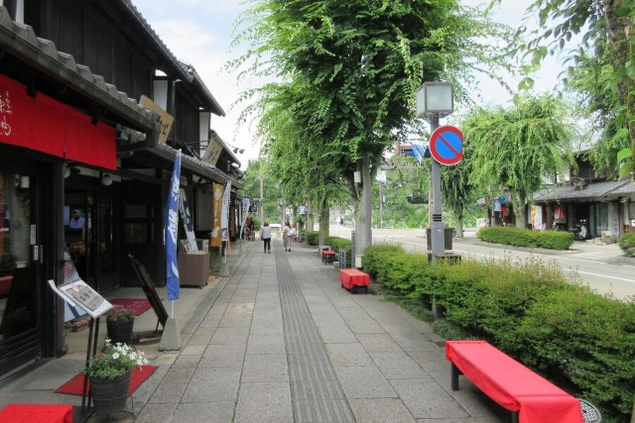 彦根城のお堀にかかる京橋からすぐ。白壁と黒格子の町屋風に統一された街並みは江戸時代の城下町をイメージしています。和菓子屋、洋菓子屋、地元ならではの商品を扱うお店が軒を並べ、古き時代と新しい時代の薫り漂う「OLD NEW TOWN」 です。